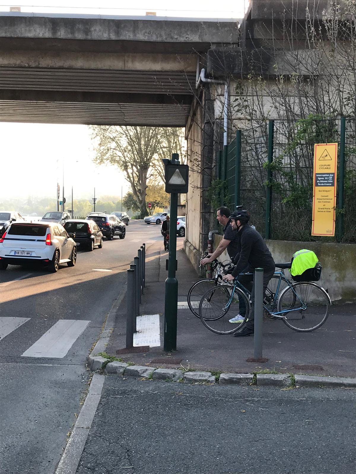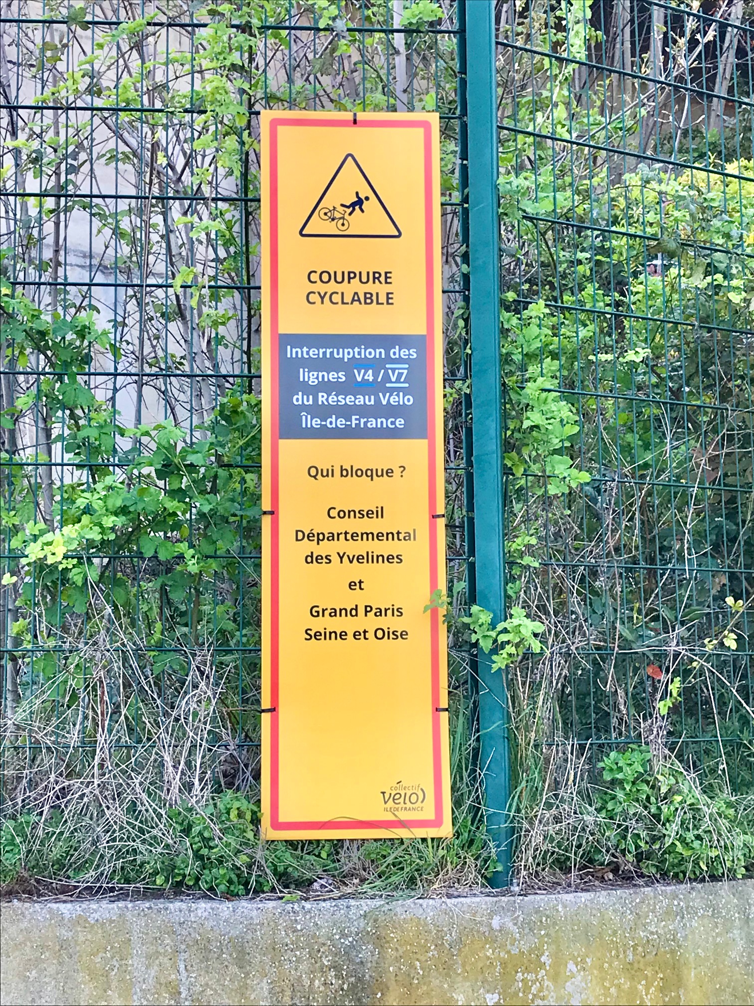 Mercredi 9 avril 2025 à 18h30, une action conjointe des associations vélo et du Collectif Vélo Île-de-France a eu lieu dans les communes concernées avec la pose d’un panneau pour dénoncer les coupures cyclables du Réseau Vélo Île-de-France (VIF),