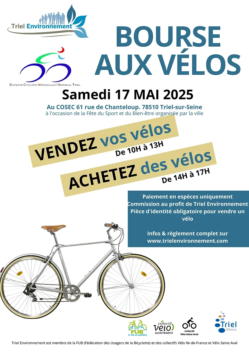 🚴♀️ Vous souhaitez acheter un vélo d'occasion ? Vos vélos prennent la poussière au fond du garage ? Ne manquez pas la Bourse aux Vélos de Triel Environnement ! 🚴