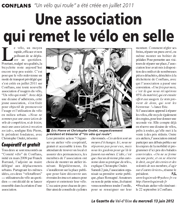 Un article qui retrace bien les débuts de notre association, qui n'avait pas encore de local ! Depuis, nous n'avons jamais cessé notre mission : promouvoir la bicyclette par tous les moyens, notamment par nos ateliers et notre vélo école !